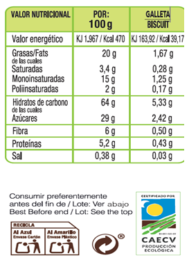 INGREDIENTES: harina integral de avena (gluten)* 21 %, harina integral de trigo (gluten)* 17%, almidón de tapioca*, aceite de oliva virgen extra* 18%, azúcar integral de caña, bebida de avena (gluten)*, semilla de chía* (Salvia hispanica) 4%, cúrcuma* 0,8%, gasificante: bicarbonato sódico, antioxidante: extractos de romero*. (*Procedente de agricultura ecológica) Puede contener frutos de cáscara y mostaza.